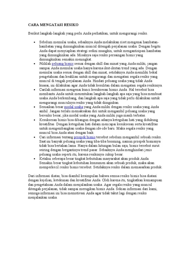 13/06/2016 · resiko keluar dari zona kenyamanan yang didapat selama ini, dan masuk ke dalam zona baru yang penuh dengan ketidakpastian. Kesimpulannya, jangan takut oleh risiko usaha karena setiap risiko ada cara mengatasinya. Identifikasi ini meliputi beberapa aspek, seperti tren pasar, keadaan sosial dan ekonomi, serta produk itu sendiri. Cara mengatasi yang pertama adalah identifikasi resiko. Jalankan bisnis anda sesuai dengan keahlian yang dimiliki.
